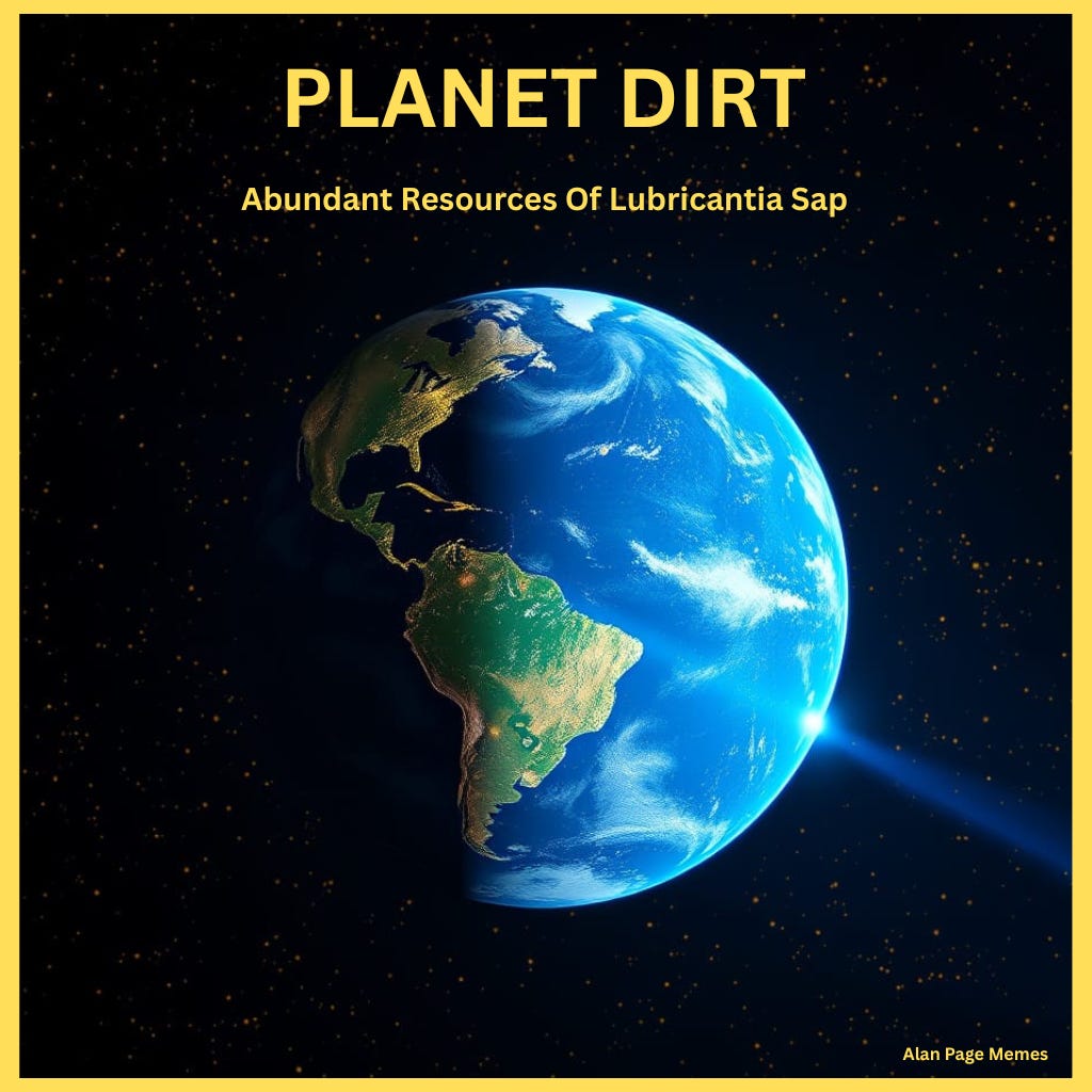 Lubricantia, a never ending lithogenic planet sap which is vital and indispensable to the Lordin Empire and its tertiary machinery. Lubricantia serves as the primary lubrication and processed energy source powering over 70% of terrestrial transportation. Lubricantia and Gasoleen together are space fuel for galaxy lifeboats, starship cutters, and LordinIt Stooka flux attack fighters of The Red Baron Wing. Planet Dirt ranks as the third-largest supplier of Lubricantia to the vast Lordin Empire, which spans across a million suns.