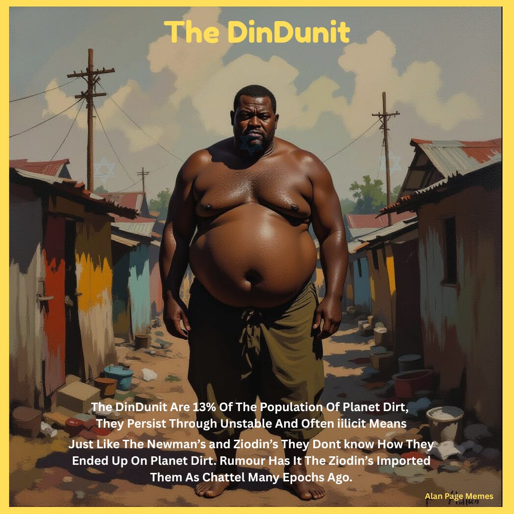 Planet Dirts relatively small population of 300 Million consists of mainly 85% Newman’s, 13% DinDunit’s and 2% declared Ziodin’s (could be more due to name changing and shapeshifting).